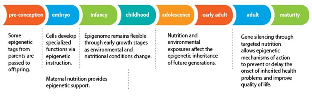 Researchers agree the Epigenome is most susceptible to environmental influences during specific developmental periods in life, including the prenatal period, infancy, puberty and maturity. How and when genes are activated (or inactivated) can have a profound effect on human development and healthy aging. If epigenetic modifications occur at crucial stages of life, they can potentially change behavior, wellness and disease susceptibility.